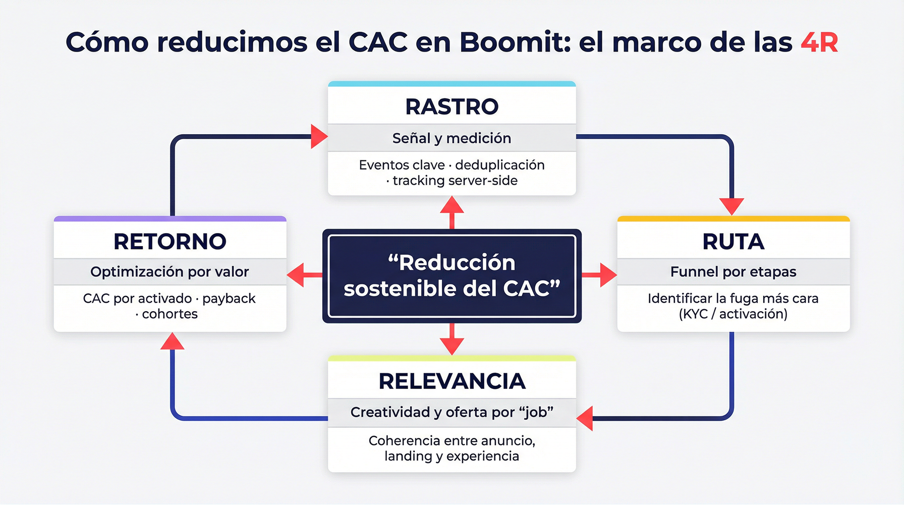 En Boomit lo trabajamos como una máquina conectada, no como “campañas sueltas”. La reducción de CAC sostenible aparece cuando conectás señal, funnel, creatividad y valor. Una forma fácil y simple de recordarlo es pensar en las 4 Rs: